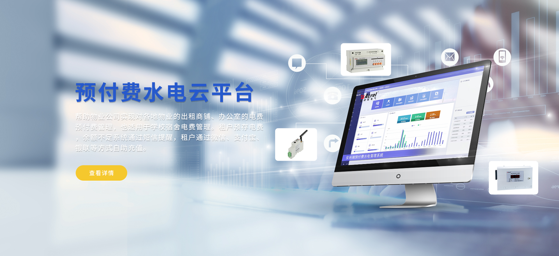 安科瑞提供的解決方案包括Acrel-EIoT能源物聯網云平臺、變電所運維云平臺、安全用電管理云平臺環保用電監管云平臺智慧消防云平臺能源管理云平臺、工業企業能源管控平臺、遠程預付費云平臺、餐飲油煙監管云平臺、電動汽車/電瓶車充電樁收費管理云平臺、電力監控/無線測溫系統、電能質量治理系統、電氣火災監控系統消防設備電源監控系統、防火門監控系統應急照明和疏散指示系統、智能照明控制系統、醫用隔離電源絕緣監測系統等,幫助用戶實現能源智能化、可視化、精細化管理,提高用能效率和用能安全,為企業節能降耗和實現能源數字化建設提供數據服務。